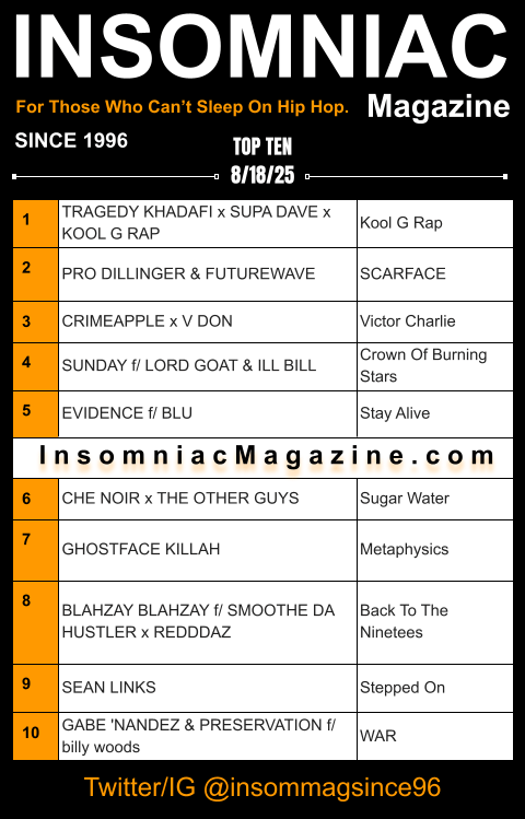 For decades we’ve run counter to the current, charting a course toward titanic talent too authentic for the mainstream. Roll into this edition of Insomniac Magazine’s Weekly Hip Hop Top Ten as the tradition continues with a bevy of seismic selections.