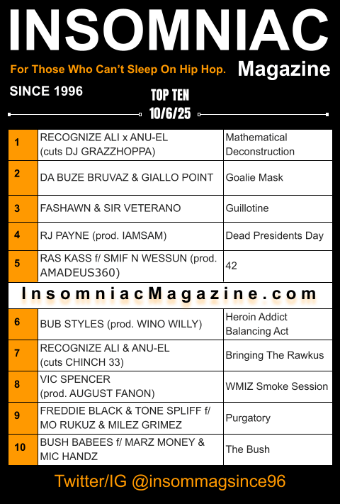 Brace yourself for an incandescent package of volcanic ambiance for your playlist. Without delay, roll the uncontainable kinetic speaker stylistics on this edition of Insomniac Magazine’s Weekly Hip Hop Top Ten.