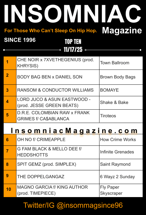For nearly three decades, Insomniac Magazine has been the pulse check for Hip Hop purists. Every week, the top ten is a sanctuary for artisanal bars and potent production. Regardless of the vapid trends in the rap space, true heads know, real Hip Hop has continued to be celebrated on Insomniac Magazine!