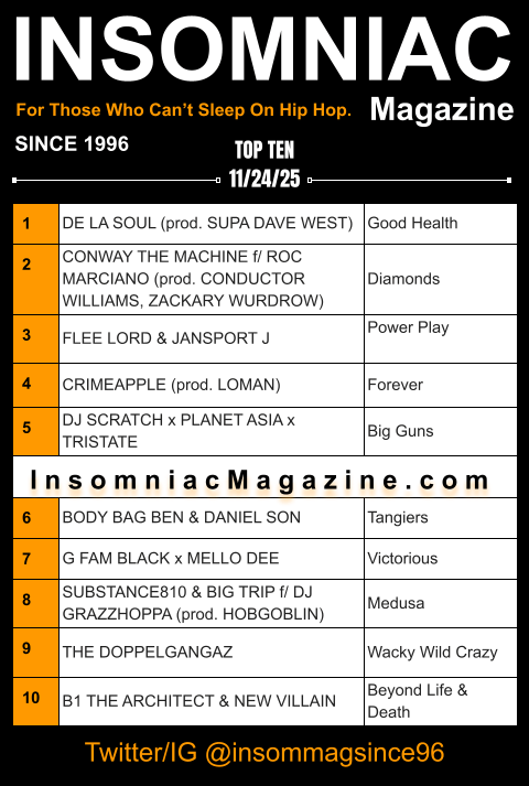 Insomniac Magazine has covered the culture since the 1990s, providing a platform, including online, for lyrical and production artisans unlikely to get coverage on commercial radio or mainstream media. Decades later, the dedication to bolster the sounds of the underground is still unwavering. With that said, it’s that time again. Get ready to roll a bounty of talent and supreme steez on another edition of Insomniac Magazine’s Hip Hop Top Ten.