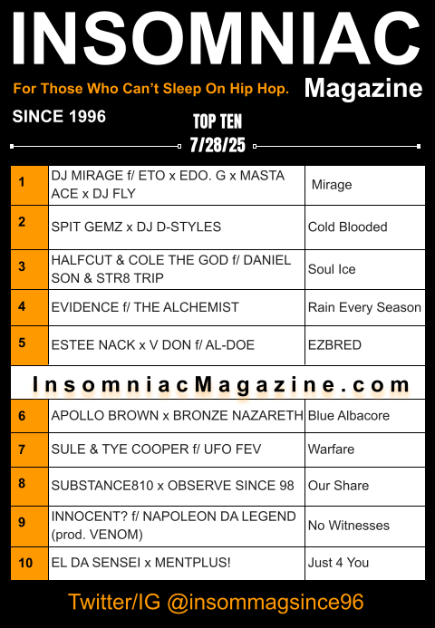 Once again, we’ve cherry-picked the crown jewels of artisanal mastery for another edition of Insomniac Magazine’s Weekly Hip Hop Top Ten. Immerse yourself in the culture of bar supremacy and audio artistry with these potent pieces.